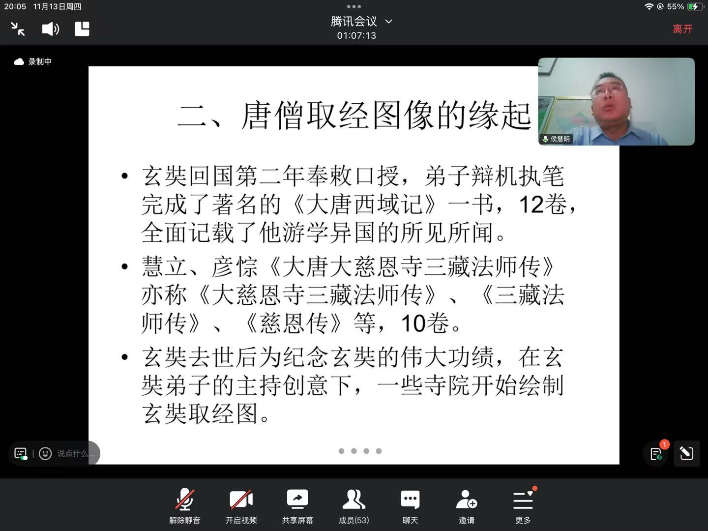 2025 年 11 月 13 日 19:00-21:00,山西省五台山文化生态讲坛 2025 年第 8 期(总第 46 期) 通过腾讯会议(会议号:259-144-549)如期举行。本次讲坛特邀山西师范大学历史与旅游文化学院教授、博士生导师侯慧明担任主讲嘉宾,以 “山西现存唐僧取经图像考”为专题,凭借扎实的田野调查与文献研究,揭开元代唐僧取经图像的历史密码,分享山西佛教壁画研究领域的重要新成果。